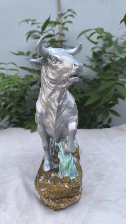 13 Inch Silver Bull Showpiece | Powerful Ox Idol for Office Desk, Home Decor & Gifting