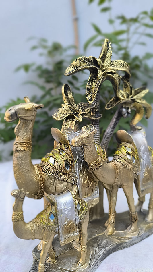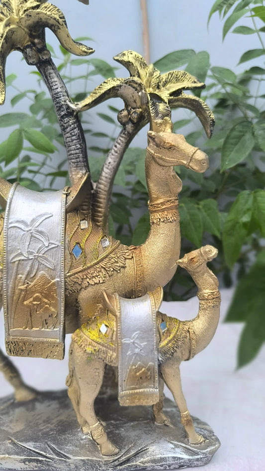 14 Inch 3 Camel Showpiece with Palm Tree | Golden Silver Resin Desert Decor Statue for Home, Office & Gifting