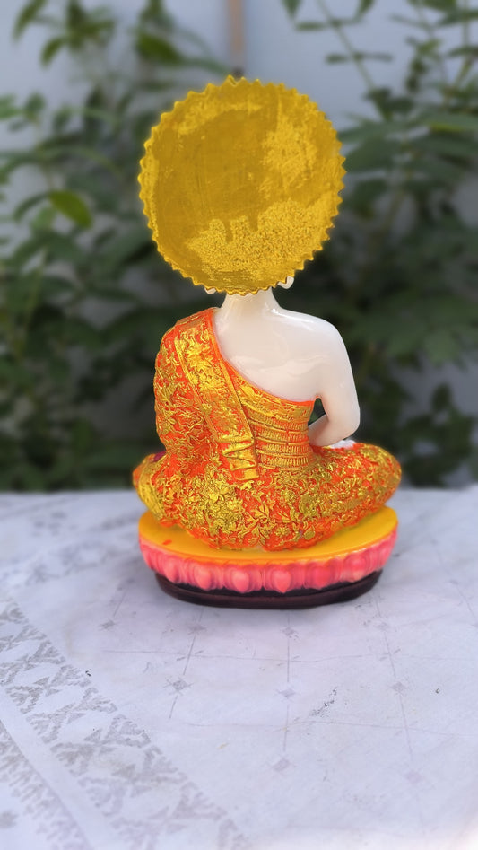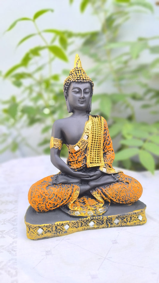 Resin Meditating 9 Inch Buddha Idol with Orange Golden Robe | Spiritual Buddha Statue for Home Decor, Office & Gift | Peaceful Showpiece for Meditation Corner