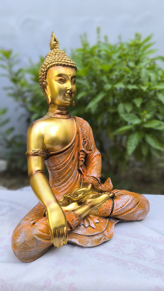 13 Inch Golden Orange Resin Buddha Idol | Meditating Gautam Buddha Statue for Home, Temple & Gift Decoration