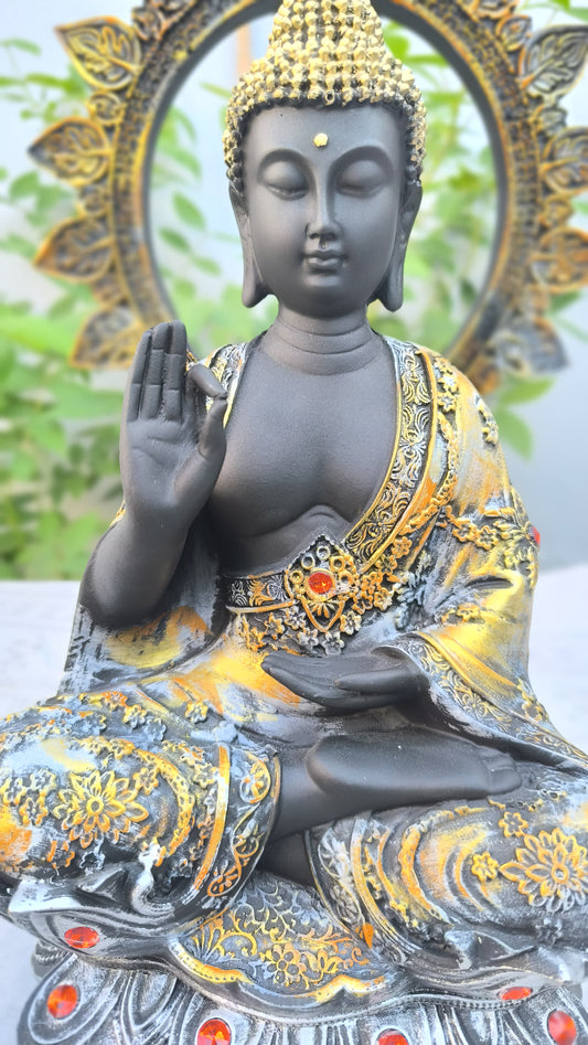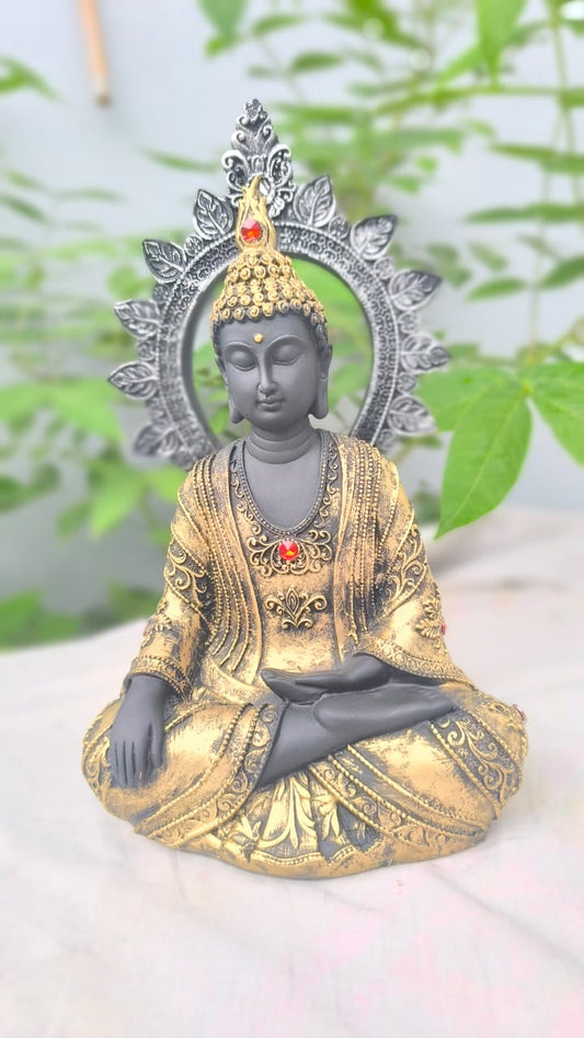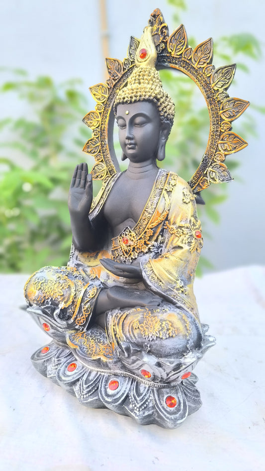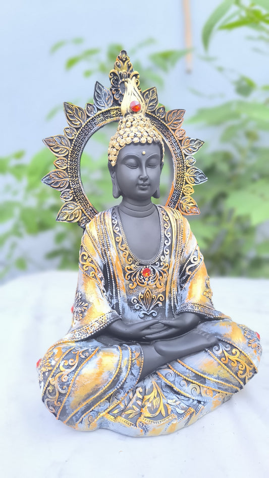 13 Inch Black Buddha Idol with Golden Halo | Decorative Resin Buddha Statue for Home, Meditation Room & Gift Purpose.