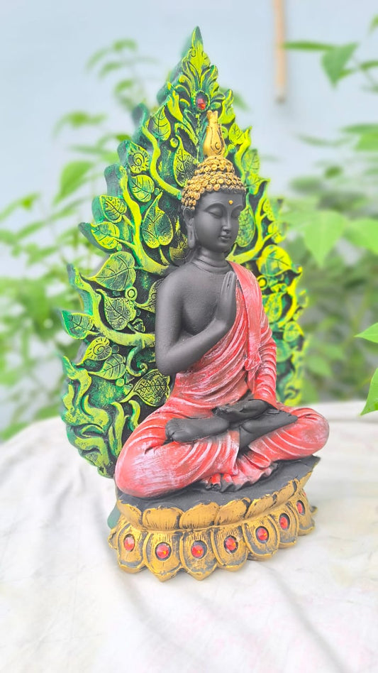 14 Inch Buddha Statue with Leaf Back Design | Resin Meditation Buddha Idol for Home Decor & Gifting